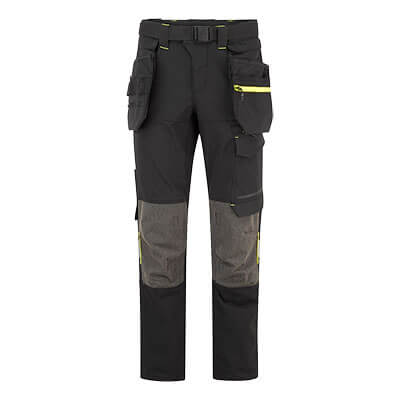 The EV4 Stretch Holster Trouser offers an enhanced ergonomic design, featuring water resistant fabric at the lower leg. With a high-rise back waistband and side elastication, it provides excellent protection in all working positions. The trousers include pre-bent, side-loading adjustable knee pad pockets, spacious front pockets, and versatile zip thigh pockets for secure storage of phones, pens, and tools. Triple stitching throughout ensures maximum durability.