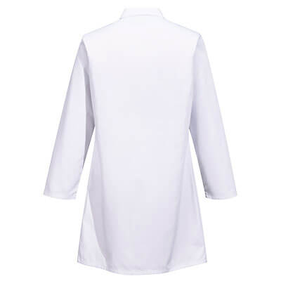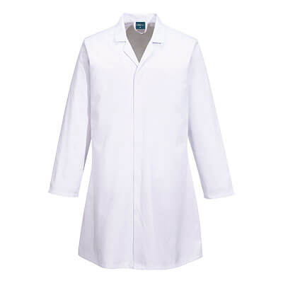 White lab coats with the contrast collars are designed to identify high risk areas to avoid potential cross contamination. They are food safe with no pockets that can trap dirt and bacteria and washable at 60degrees suitable for infection control regulations.
