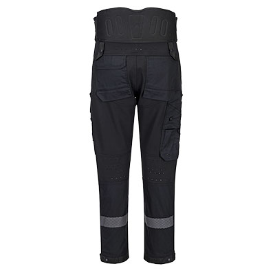 The DX4 Back Support Trouser is ergonomically designed and uses the combination of targeted placement of dynamic 4X stretch fabrics and the back support to give maximum range of movement when working. The support reinforces the spine, supports the abdomen and lower back. The belt can be adjusted for added comfort and is suitable to be worn under or over clothing. The trouser features a back support, a high rback waistband with side elastication, ensuring protection in all working positions. Pre-bent top loading adjustable knee pad pockets, generously sized front pockets and multi-functional zip thigh pockets offers secure storage of phone, pens and tools. Triple stitching throughout for maximum durability.