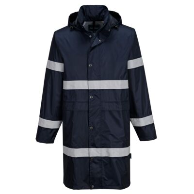 • Lightweight and practical the Iona Rain Jacket 40" offers waterproof protection and enhanced visibility. Features include pack-away hood, large storage pockets and vented back yoke and eyelets for ventilation.