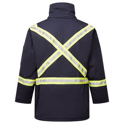 • SHELL FEATURES • Engineered for flame resistance and guaranteed for the life of the garment • Lowered X striping on back to allow more room for company logo or hooded undergarment • Flame resistant fleece lined hand pockets • Multi-purpose protection from electric arc, flash fire, molten ferrous metal and welding exposure • Two-way zipper INSULATION PACKAGE - 14 OZ QUILTED FEATURES • Wind and vapour barrier STANDARDS • Westex UltraSoft® fabric meets the requirements of: NFPA 2112, CGSB 155.20, NFPA 70E, CSA Z462, ASTM F1506
