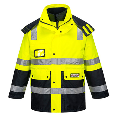 • 4in1 high visibility jacket, fully waterproof/breathable BREATHETEC™ coating on fabric. Premium reflective tape, fully lined outer jacket, embroidery access (on outer jacket only), zip out quilted jacket/vest, concealed hood, fold-away ID window pocket, UPF50+.